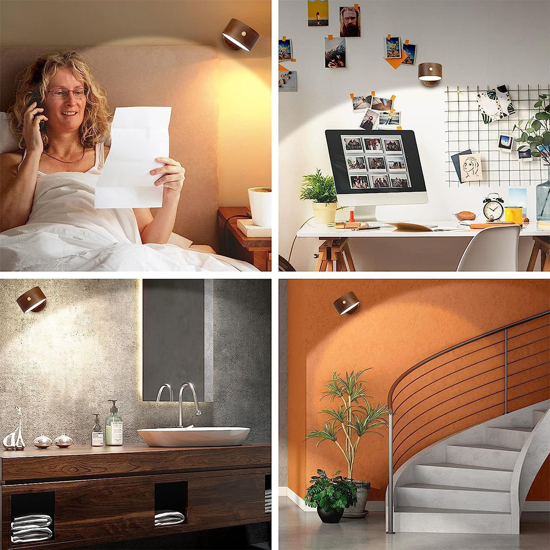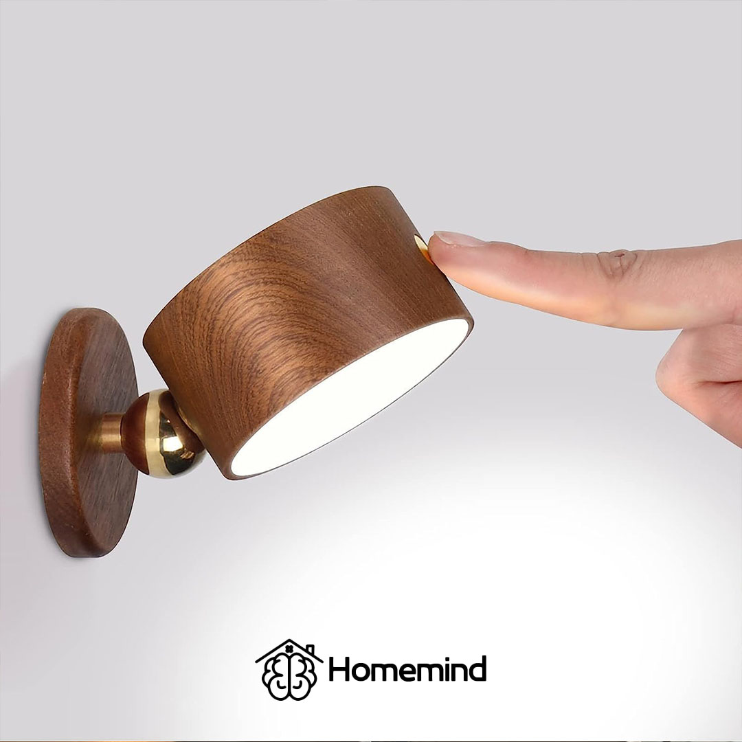 چراغ چوبی دیواری ۳۶۰ درجه با طراحی طبیعی، نور قابل تنظیم لمسی و نصب آسان؛ ترکیبی از زیبایی و کاربرد برای دکوراسیون داخلی.